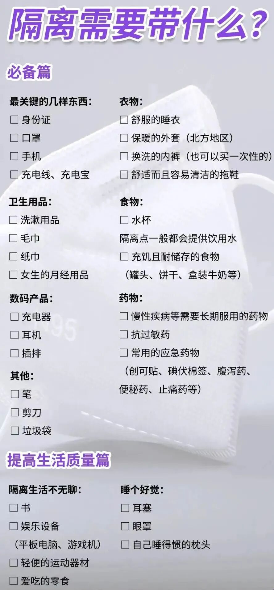 最近疫情形势复杂,很多人都开始担心自己突然被通知去方舱隔离,如果要去方舱,应该准备些什么呢?这张物资清单可以提供一些参考思路。