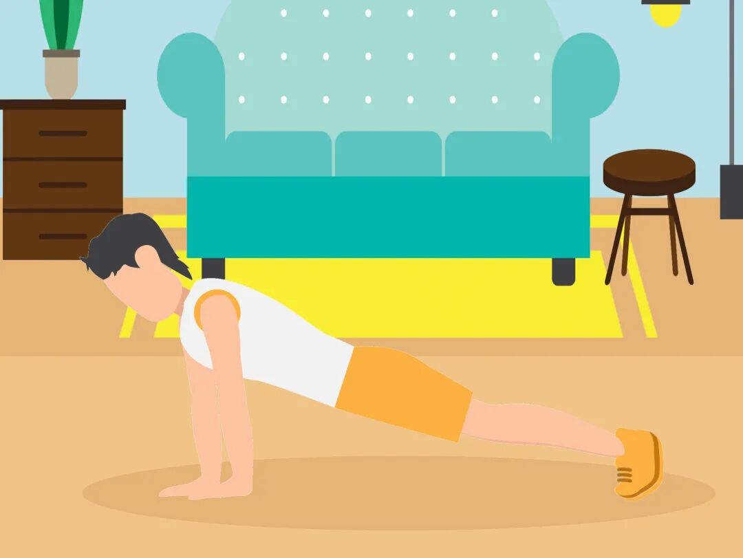 双手与肩同宽支撑,两脚打开与肩同宽,保持一个基础平板支撑姿态。从头部到臀部保持一条直线,脖子保持正直,与两肩连线垂直。当你屈肘的时候,记得尽量将手肘贴近身体。