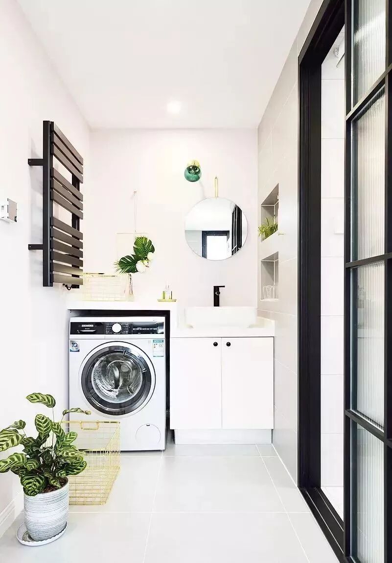 卫生间的洗手台被放在了门外,还把洗衣机也嵌入了洗手台当中。侧方的壁龛和置物架、脏衣篓让平时使用更加方便一些。