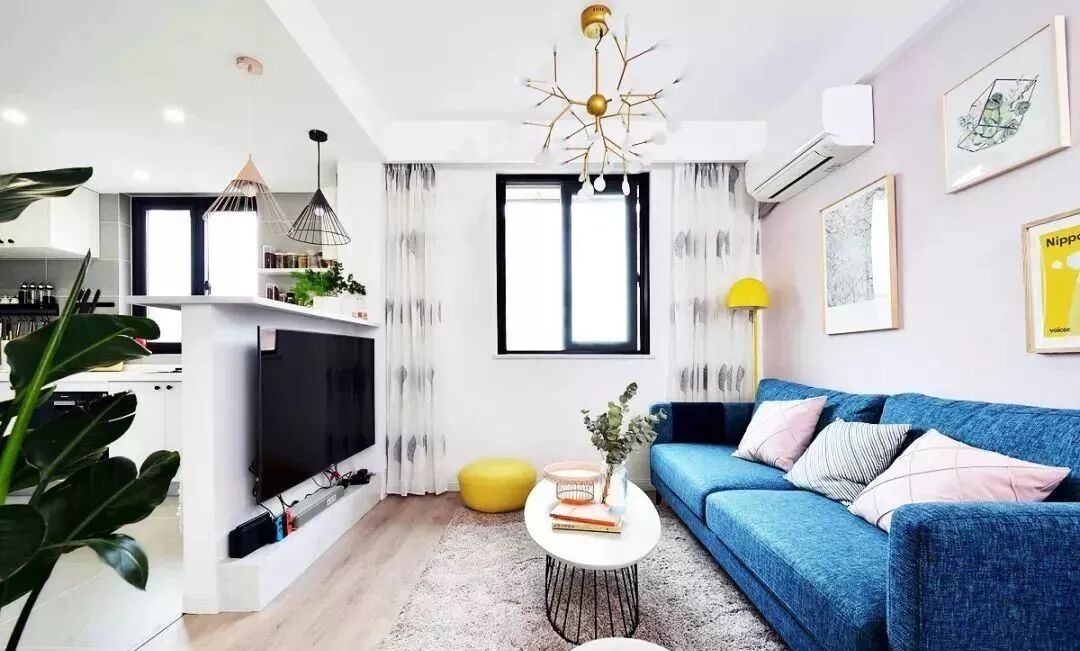 玄关的侧方就是客厅空间,亮眼的黄色和蓝色在浅色调的空间内,显得更有活力。电视背景墙做成了半墙的设计,和客厅和厨房连通。