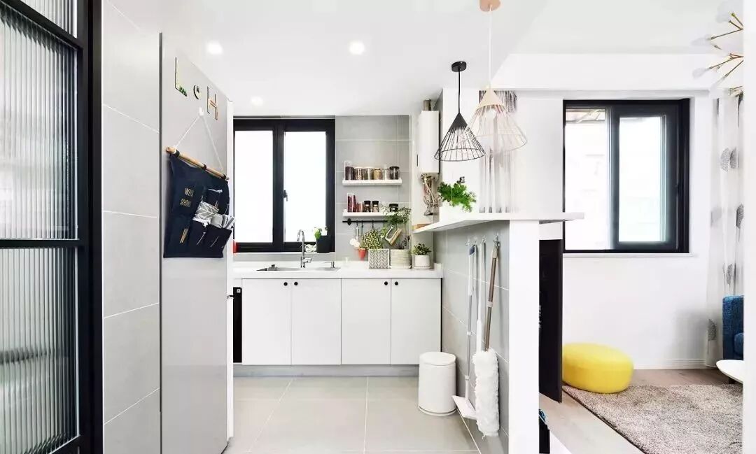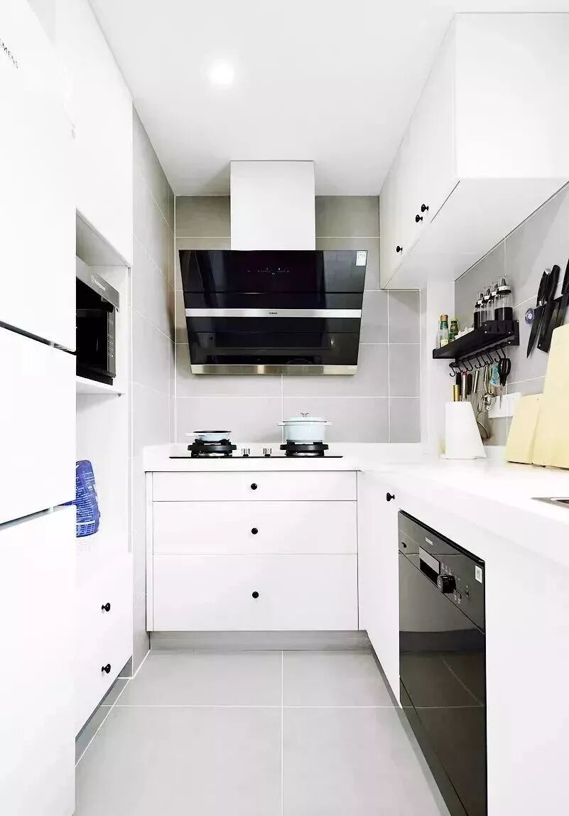 厨房内部是做了U字形的橱柜布局方案,让厨房动线变得更短一些。在橱柜和吊柜之间的墙面加上挂杆、置物架等,让厨房收纳更为合理。