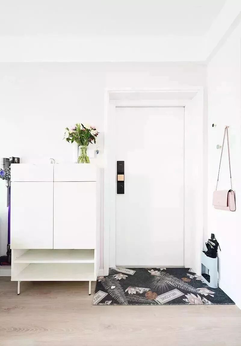 入户没有玄关走廊的户型,在入户门的侧方摆放鞋柜,另一侧墙面做挂钩,铺设一个地毯可以避免对木地板的损伤,这个雨伞架的款式也很好看。