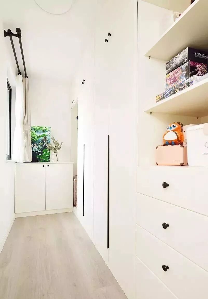 在卫生间和儿童房之间有着一个狭长的空间,被设计师利用起来改造成了衣帽间,满墙的柜子和开放式搁架结合起来,满足不同的收纳需求。