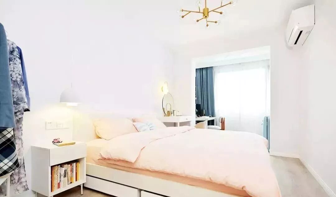 主卧室通体以白色为主,搭配了藕粉色的床品和金属质感的吊灯,其中一侧床头柜还改成了梳妆台,使用起来非常方便。
