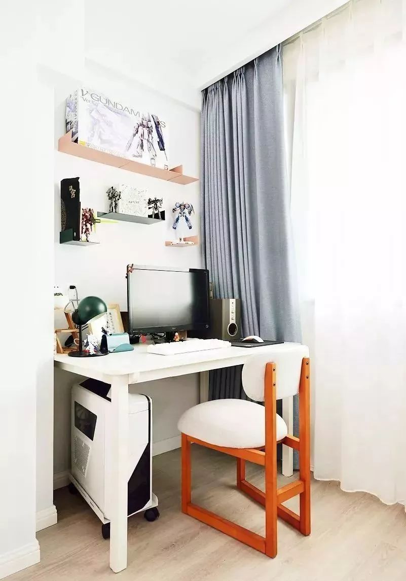 而卧室外的小阳台是被改成了书房工作区,在一侧摆放书桌和书架,另一侧留下的空余空间也能用来晾晒衣服。